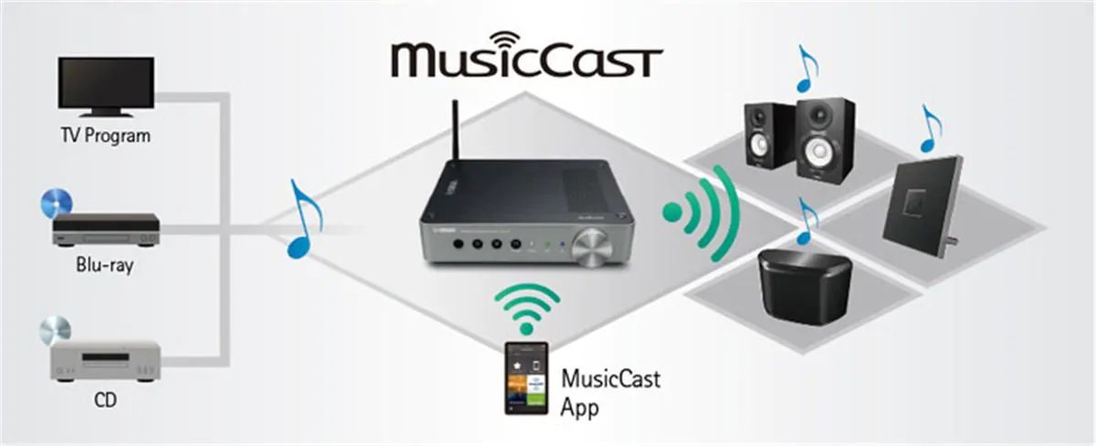 MusicCast folosește o rețea wireless de înaltă performanță pentru a oferi muzică și plăcere audio. Poate transmite conținut muzical digital de pe smartphone, PC sau NAS către alte dispozitive MusicCast din casă. De asemenea, poate partaja muzica de pe dispozitive externe, cum ar fi un televizor sau un player Blu-ray Disc™ conectat la WXA-50. Conținutul audio de pe smartphone-uri sau tablete conectate prin Bluetooth® poate fi transmis și pe dispozitivele MusicCast din mai multe camere.
