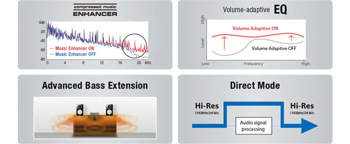 Datorită tehnologiilor superioare de procesare a sunetului de la Yamaha, vă veți bucura de un sunet grozav din toate sursele dvs. de muzică – indiferent de calitatea acestora, de mediul dvs. de ascultare sau de tipul de difuzoare pe care le utilizați. Când ascultați sunet de pe smartphone-uri sau alte surse comprimate, Compressed Music Enhancer îmbunătățește considerabil sunetul la toate nivelurile de frecvență. EQ adaptiv la volum ajustează automat echilibrul bas/înalte în funcție de nivelul volumului. Advanced Bass Extension oferă un sunet mai profund și mai bogat, la nivel scăzut – este grozav pentru difuzoarele compacte sau de perete. Și un mod Direct vă permite să redați surse audio de înaltă rezoluție așa cum sunt, fără nicio procesare.