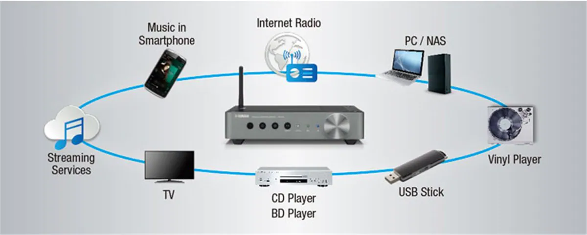 WXA-50 este compatibil cu toate tipurile de surse și servicii muzicale, cum ar fi serviciile de streaming. Prevăzut cu diferite tipuri de terminale pentru conectarea unui televizor, CD player, computer și alte echipamente AV, vă veți putea bucura de muzică din întreaga lume în toată casa dvs. dintr-o singură componentă.