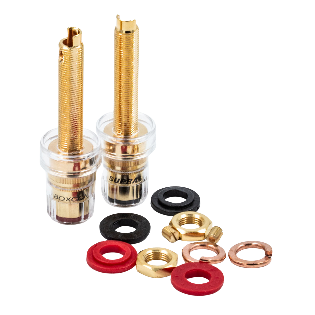 SUPRA BoxCon este un conector pentru șasiu placat cu aur de 24K, proiectat pentru performanță maximă și durabilitate. Ideal pentru difuzoare și șasiuri de amplificatoare, acest conector acceptă o secțiune transversală maximă a cablului de 10 mm², precum și furci (fork) și pini BFA/banana.