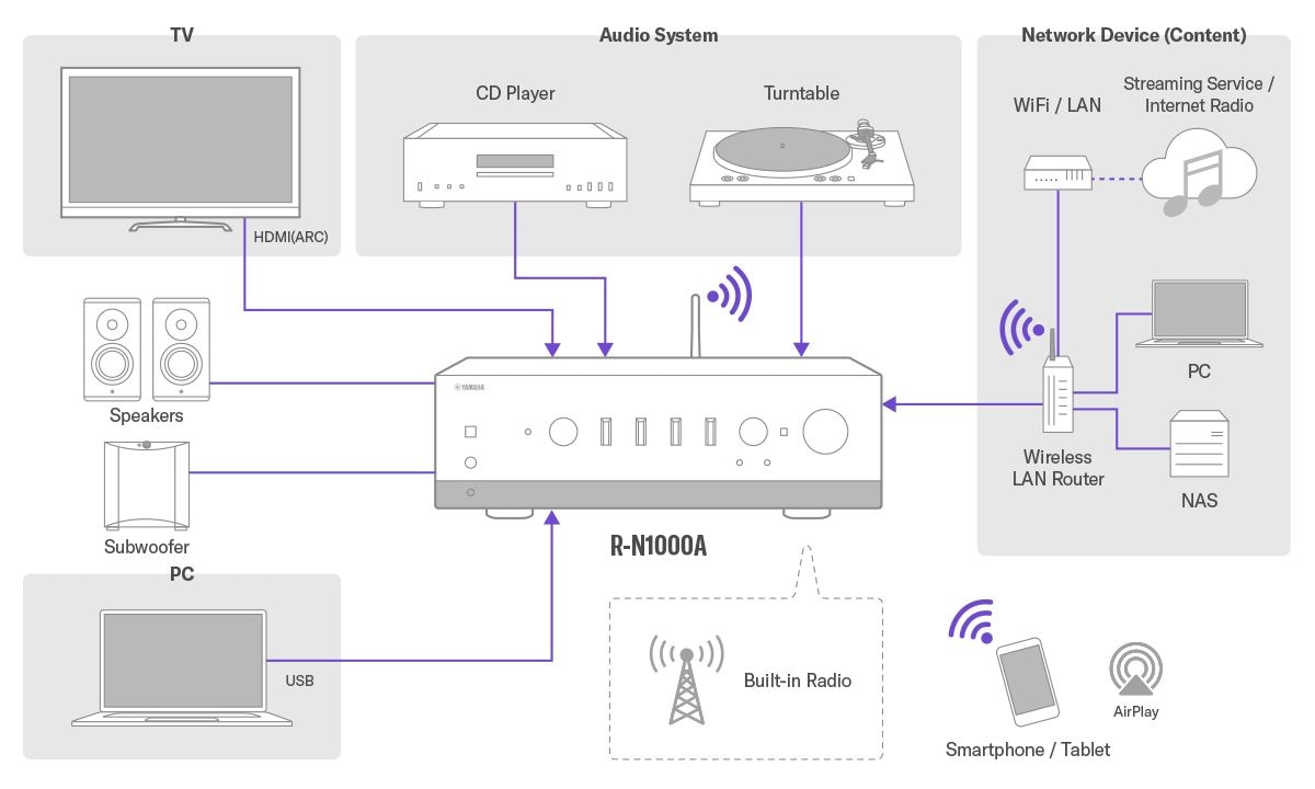 Conținutul de divertisment de la discuri, televizor, CD-uri și alte surse conectate la R-N1000A poate fi trimis către alte dispozitive MusicCast și poate fi savurat în toată casa. În plus, toate produsele MusicCast au fost proiectate în primul rând pentru o calitate superioară a sunetului. Sunt acceptate formate audio de înaltă rezoluție, inclusiv Apple Lossless (ALAC) de până la 96 kHz, WAV și FLAC sau AIFF de până la 384 kHz.