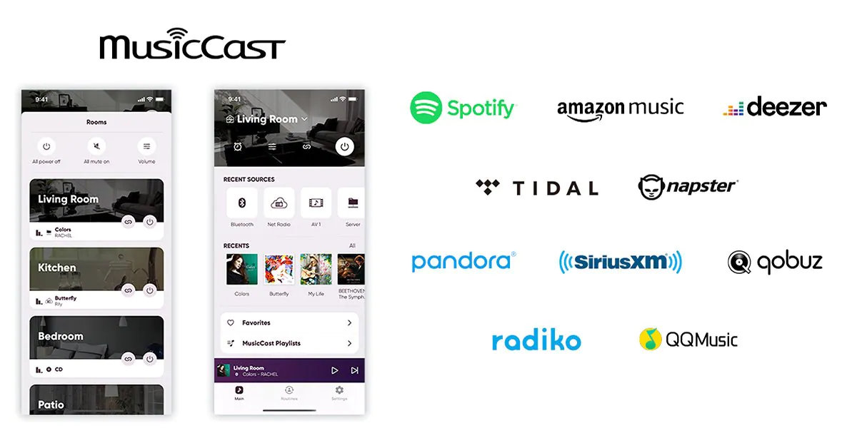 R-N2000A este echipat cu sistemul de rețea original MusicCast de la Yamaha. În plus, este compatibil cu o varietate de servicii de streaming, cum ar fi Amazon Music HD și Spotify, permițându-vă să vă bucurați pe deplin de un sunet de o calitate excepțională, unic pentru sursele de sunet de înaltă rezoluție și fără pierderi din ziua de azi, cu o fidelitate totală. De asemenea, îl puteți utiliza pentru a reda în flux Apple Music cu Airplay 2. Iar sistemul MusicCast vă permite să ascultați cu ușurință muzică oriunde în casă, prin conectarea diferitelor dispozitive MusicCast cu o singură aplicație de pe dispozitivul dvs. inteligent.