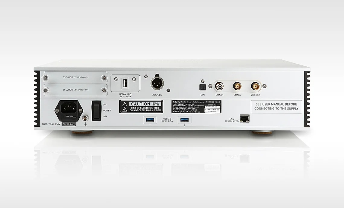 Transport în rețea cu ieșire digitală ultraperformantă cu ieșiri USB, AES/EBU, coaxiale, BNC, optice și intrare Word Clock, 2 sloturi de stocare.